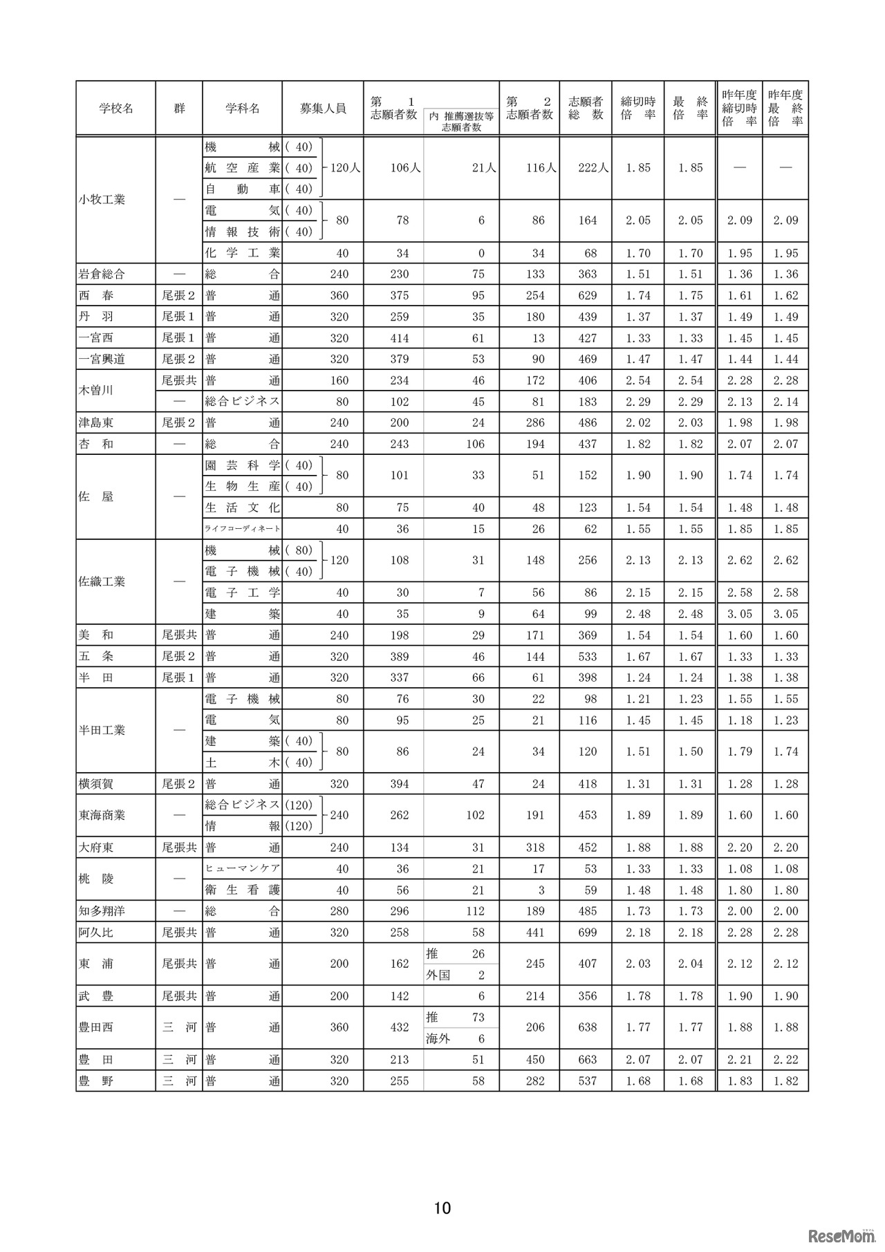 愛知県教育委員会は2019年(平成31年)2月26日、平成31年度(2019年度)愛知県公立高等学校(全日制課程)入学者選抜における全日制一般選抜・推薦選抜などの志願変更後志願者数および志願倍率を公表した。