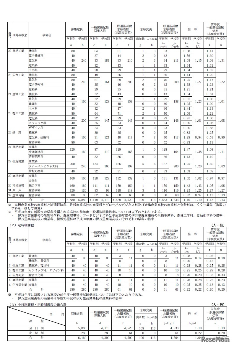 平成31年度佐賀県立高等学校入学者選抜 各学校における一般選抜試験志願状況(志願変更後)全日制・定時制、全日制・定時制の総合計