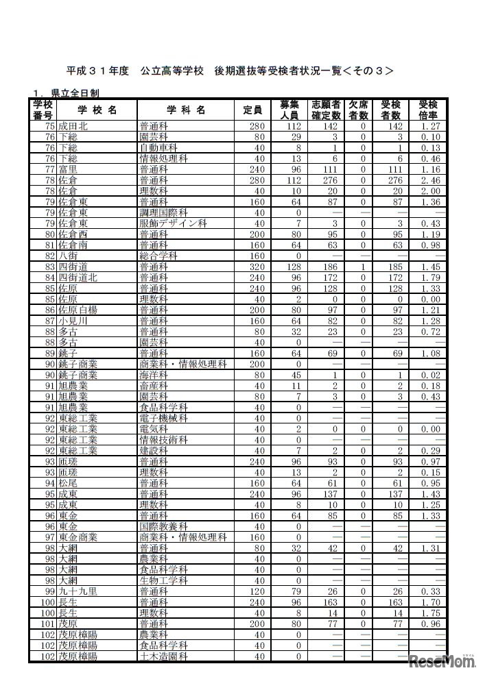 千葉県教育委員会は2019年2月28日、2019年度千葉県公立高等学校入学者選抜における後期選抜などの受検状況を公表した。全日制の課程1万5,387人、定時制の課程323人が受検。3月6日に、前期選抜などを含めた各選抜における入学許可候補者が発表される。