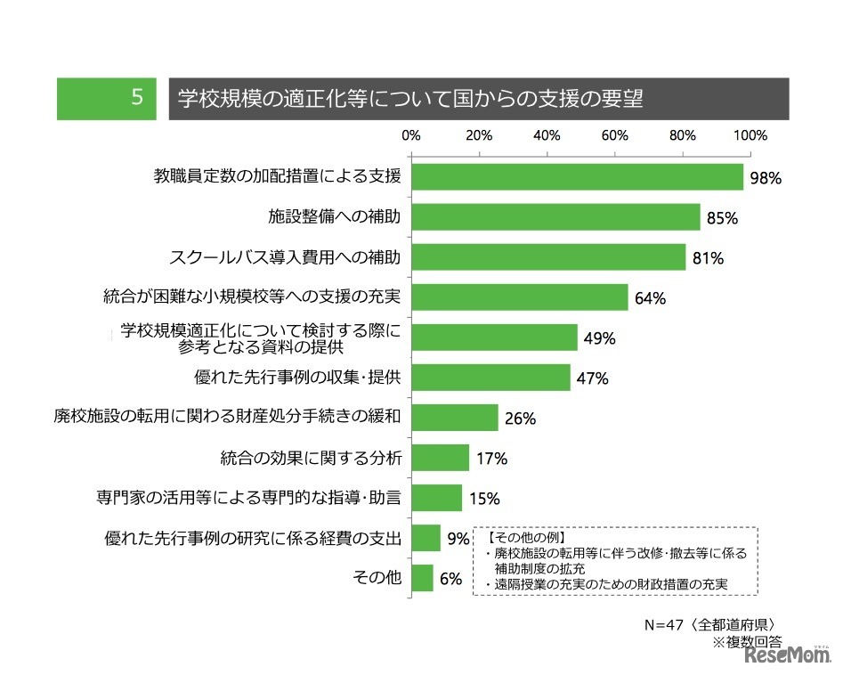 文部科学省は2019年2月28日、平成30年度(2018年度)学校規模の適正化および少子化に対応した学校教育の充実策に関する実態調査の結果を公表。規模適正化に関する国への要望では、都道府県と区市町村ともに「教職員定数の加配措置による支援」がもっとも多かった。