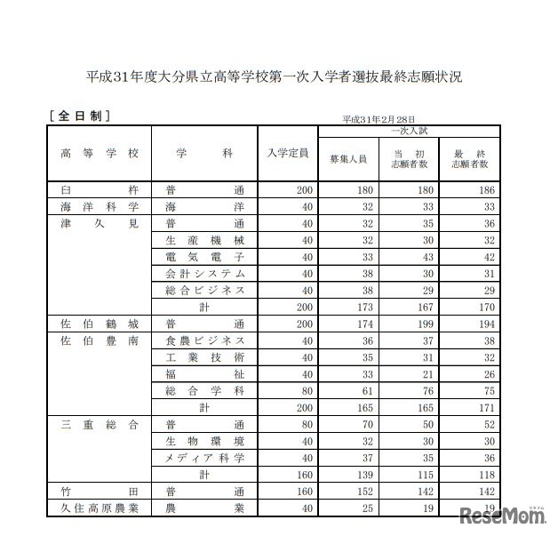 平成31年度大分県立高等学校第一次入学者選抜最終志願状況