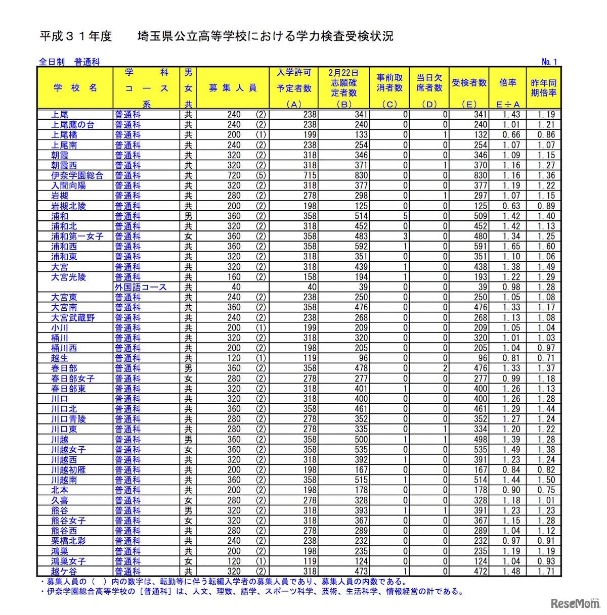 埼玉県教育委員会は2019年3月1日、2月28日に発表した「平成31年度(2019年度)埼玉県公立高等学校入学者選抜学力検査受検状況」の訂正を発表した。全日制の事前取消者数が49人から47人となり、もっとも倍率の高かった大宮(理数)が2.18倍へと修正された。