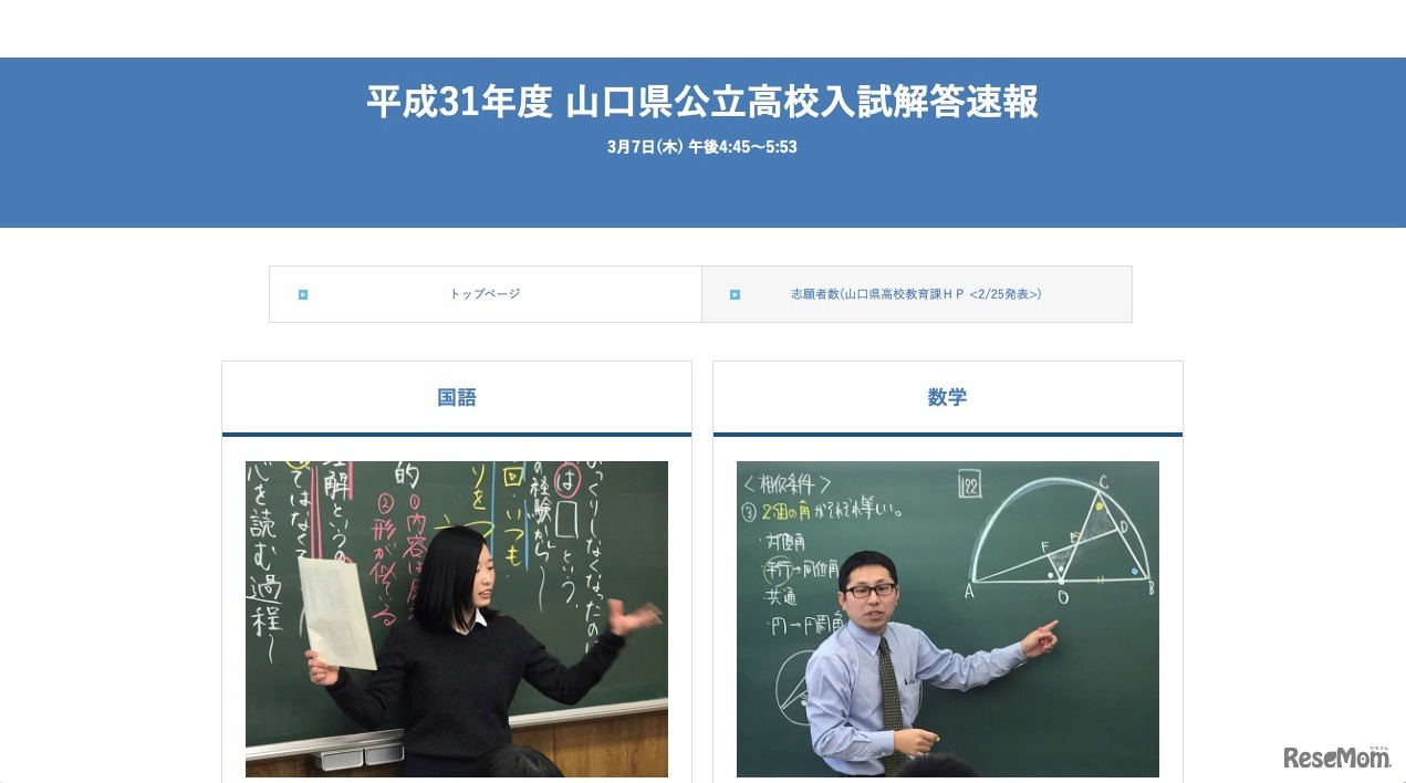 山口県公立高校入学者選抜の第一次募集にかかる学力検査が2019年3月7日に行われる。当日は午後4時45分より順次、KRY山口放送、tysテレビ山口、yab山口朝日の3局が5教科の解答速報を放映する。各局の解説は、TOP-U予備校宇部進学教室の各教科講師陣が担当。