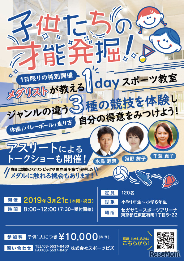 スポーツビズは2019年3月21日、「子供たちの才能発掘!メダリストによる1dayスポーツ教室 ~3種の競技を体験し自分の得意を見つけよう~」をセガサミースポーツアリーナにて開催する。対象は新小学1年生~新小学6年生。参加費は1人1万円(税別)。