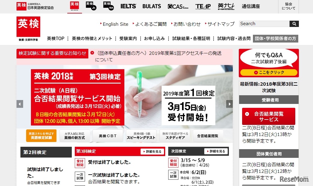 日本英語検定協会は2019年3月12日、Webサイトで「英検2018年度第3回二次試験」の合否結果閲覧サービスを開始する。団体責任者向けは正午以降、個人(英ナビ!会員)向けは午後1時以降に公開予定。