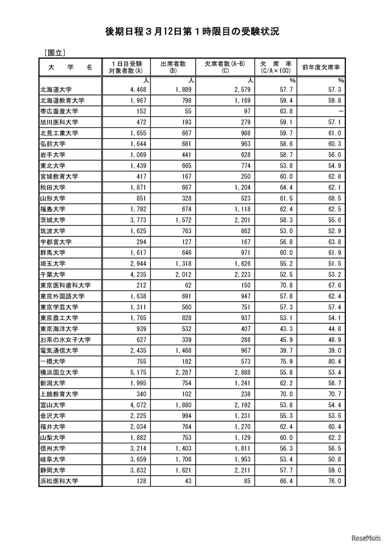 文部科学省は3月12日、平成31(2019)年度国公立大学入学者選抜 後期個別学力検査等第1日目第1時限目(受験生個々についての第1時限目)の受験状況について発表した。