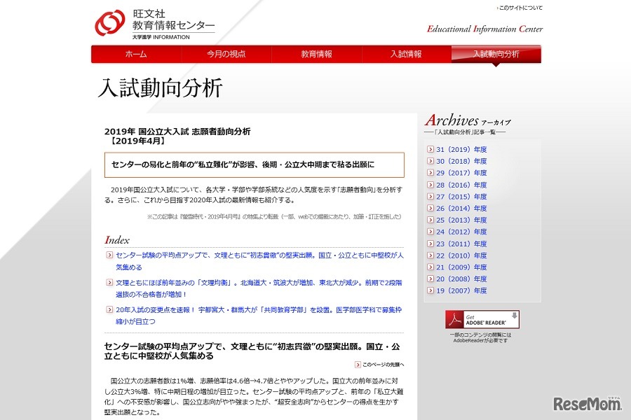 旺文社教育情報センターは、「2019年国公立大入試 志願者動向分析」をWebサイトに掲載した。2019年度国公立大入試は、私立大難化や2021年度からスタートする入試改革、センター試験の易化などが影響を与えたという。