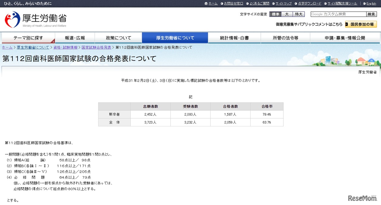 厚生労働省が2019年3月18日に発表した第112回歯科医師国家試験の合格状況によると、合格率がもっとも高いのは、「東京歯科大学」96.3%で、既卒者の合格率は100%だった。