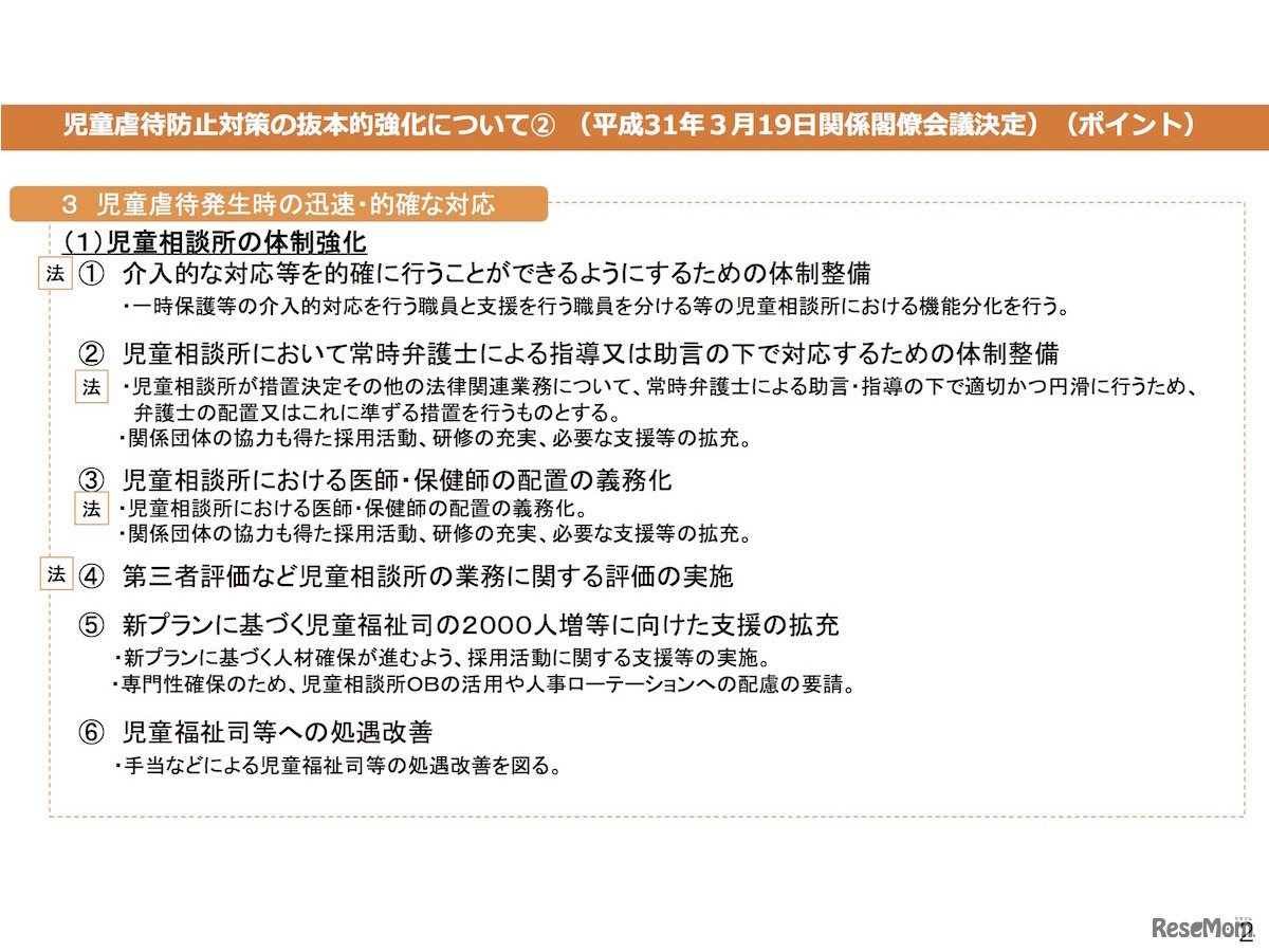 児童虐待防止対策に関する関係閣僚会議は2019年3月19日、「児童虐待防止対策の抜本的強化について」を決定。体罰禁止の法定化、児童相談所の体制強化、学校・福祉施設などの職員に関する守秘義務の法定化などが盛り込まれ、改正法案を今国会に提出する。