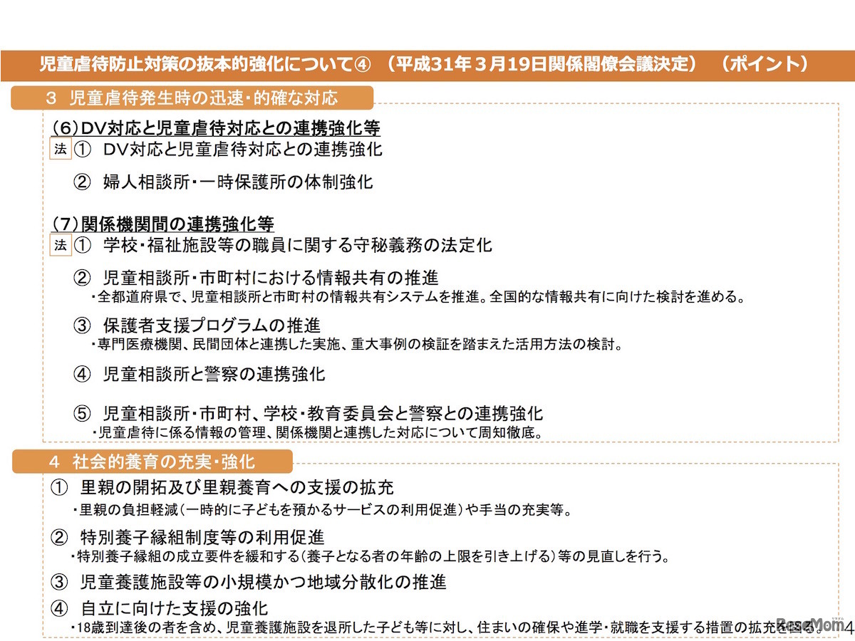児童虐待防止対策に関する関係閣僚会議は2019年3月19日、「児童虐待防止対策の抜本的強化について」を決定。体罰禁止の法定化、児童相談所の体制強化、学校・福祉施設などの職員に関する守秘義務の法定化などが盛り込まれ、改正法案を今国会に提出する。