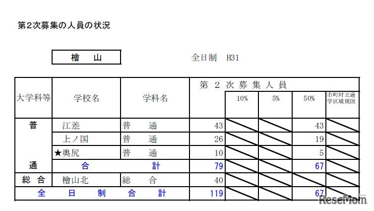 画像出典:北海道教育委員会「平成31年度公立高等学校入学者選抜第2次募集の人員の状況」 平成31年度北海道公立高等学校入学者選抜第2次募集の人員の状況・全日制(檜山)