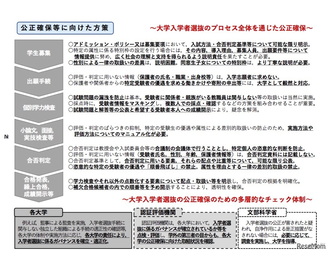 文部科学省は2019年4月5日、「大学入学者選抜の公正確保等に向けた方策について(審議経過報告)」を公表した。学生募集段階から合格発表まで、それぞれの公正確保に向けた方策を示し、大学入学者選抜のプロセス全体を通じた公正確保を掲げている。