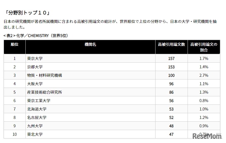 画像出典:クラリベイト・アナリティクス・ジャパン 分野別トップ10(化学)