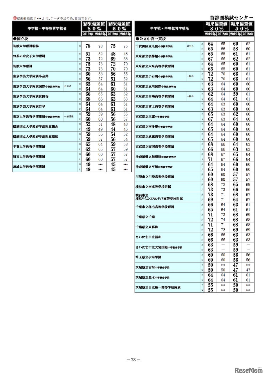 首都圏模試センターは2019年4月15日、2019年中学入試における「入試結果偏差値一覧」を公表した。合格率80%・50%の偏差値を男女別・地域別に掲載している。男子は開成、聖光学院、渋谷幕張、筑波大駒場が78、女子は慶應義塾中等部と渋谷幕張が78となった。