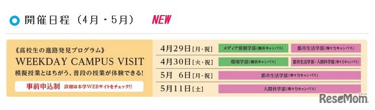 東京都市大学は、高校生向け授業公開型の進路発見プログラム「WEEKDAY CAMPUS VISIT(ウィークデー・キャンパス・ビジット)」を開催する。2019年4月29日、30日、5月6日、11日の4日間、4学部6学科が講義や演習を実施。大学の通常授業が体験できる。参加無料。事前申込制。