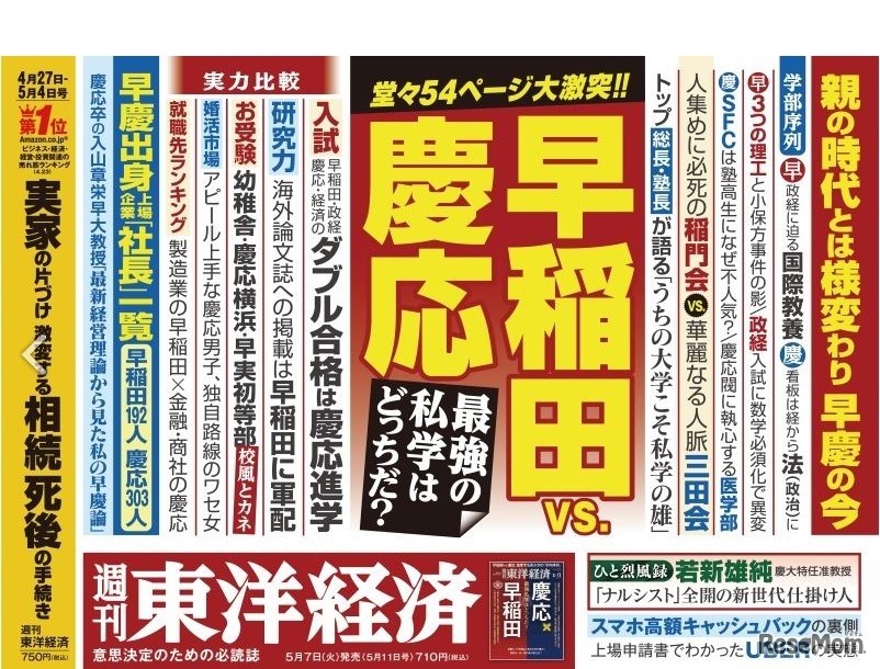 東洋経済新報社は2019年5月7日、週刊東洋経済の5月11日号を発売した。「早稲田vs慶応」と題して、早稲田大学と慶應義塾大学の実力を徹底比較。両校の入試難易度、受験生の人気、卒業生ネットワークなどを特集している。定価は710円(税込)。