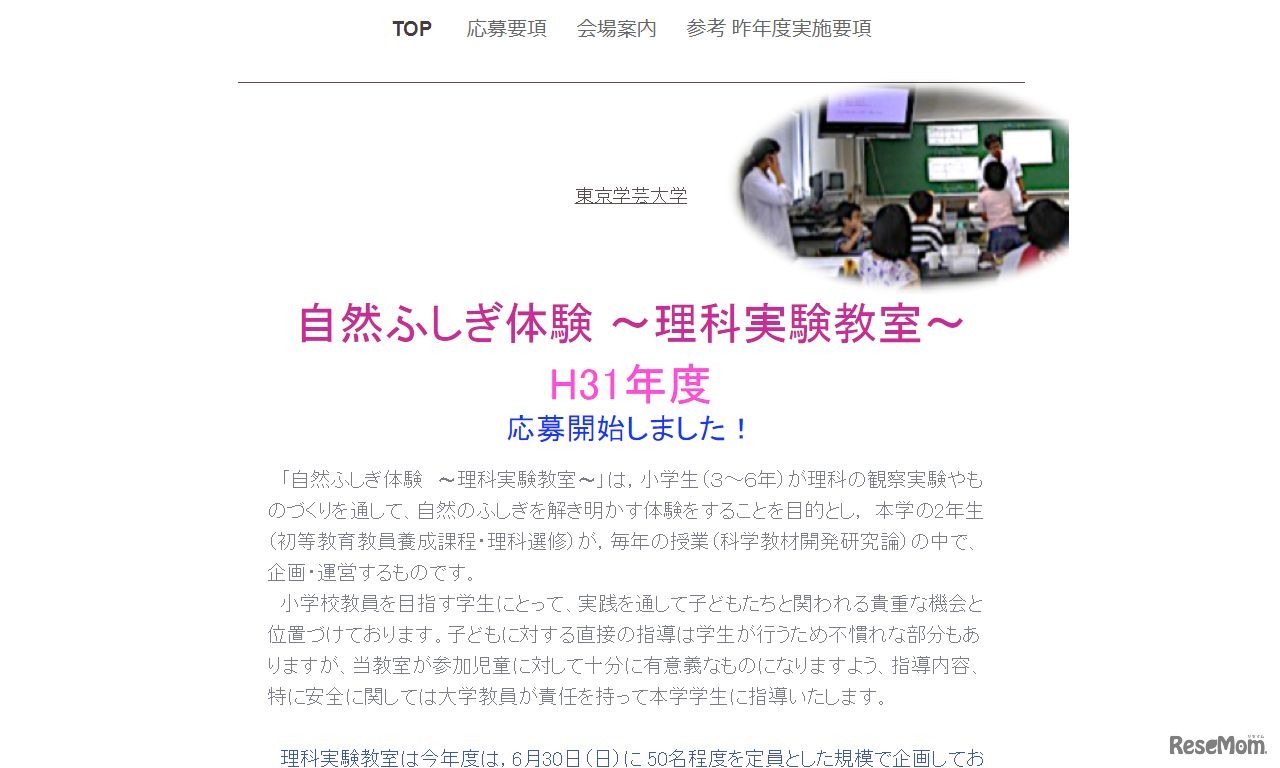 東京学芸大学は2019年6月30日、小学3年生から6年生を対象に2019年度「自然ふしぎ体験~理科実験教室~」を開催する。応募は、Webサイトにて5月20日まで受け付けている。定員は50名(予定)。