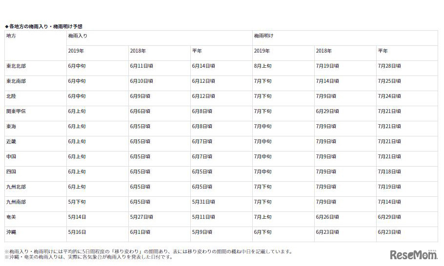 画像出典:ウェザーニューズ 2019年 各地方の梅雨入り・梅雨明け予想