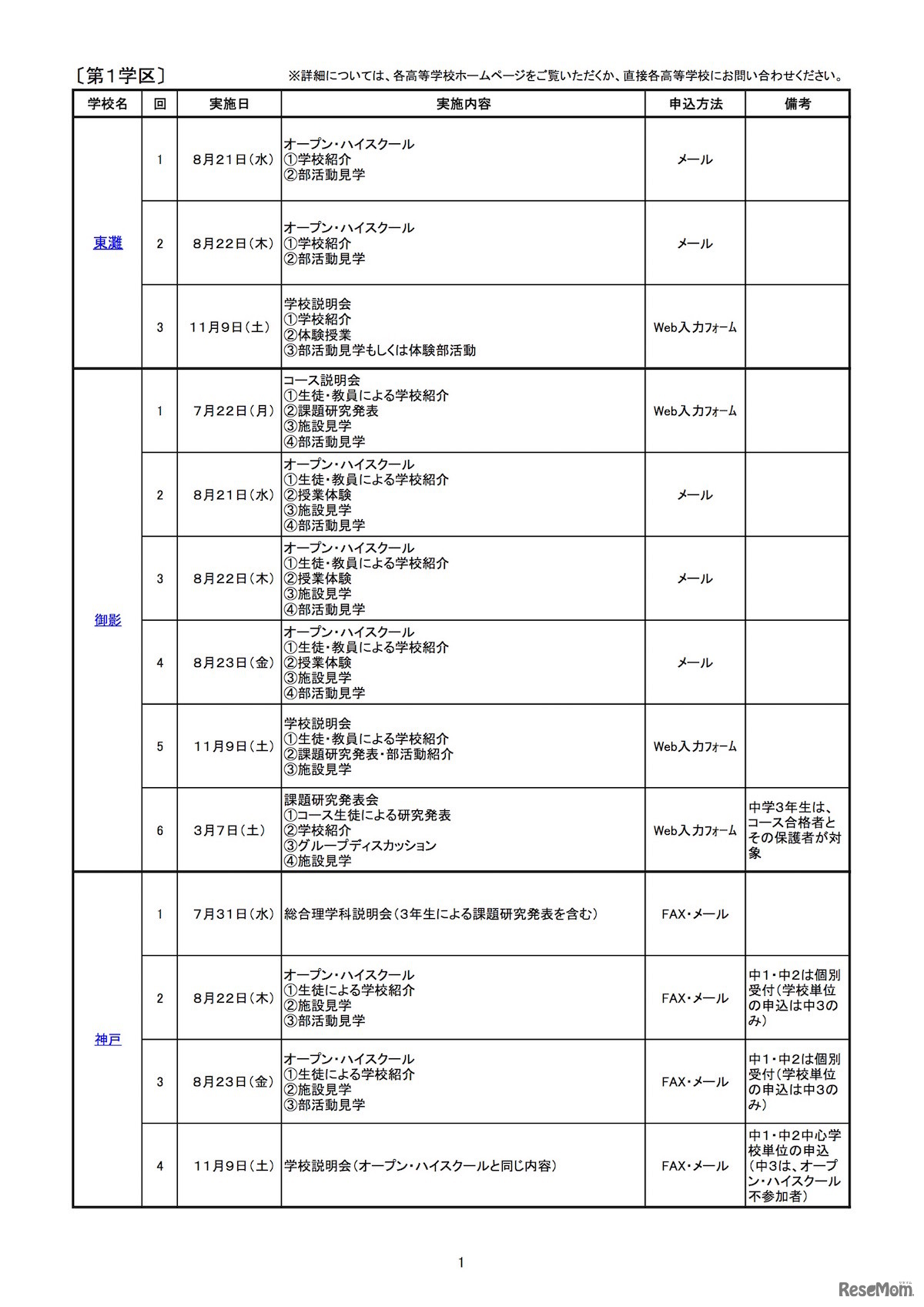 画像出典:兵庫県教育委員会 オープン・ハイスクール等の日程・内容など(第1学区・一部)