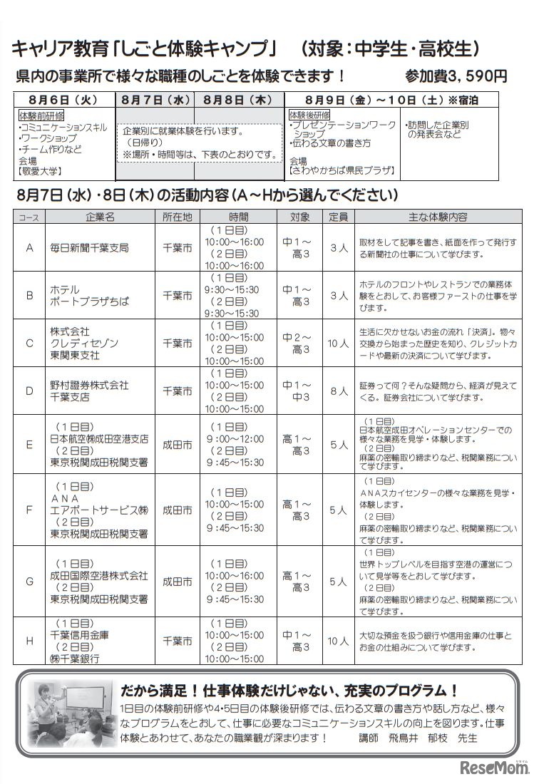 画像出典:千葉県教育委員会「令和元年度千葉県夢チャレンジ体験スクール参加者募集」 キャリア教育「しごと体験キャンプ」 (中高生対象)