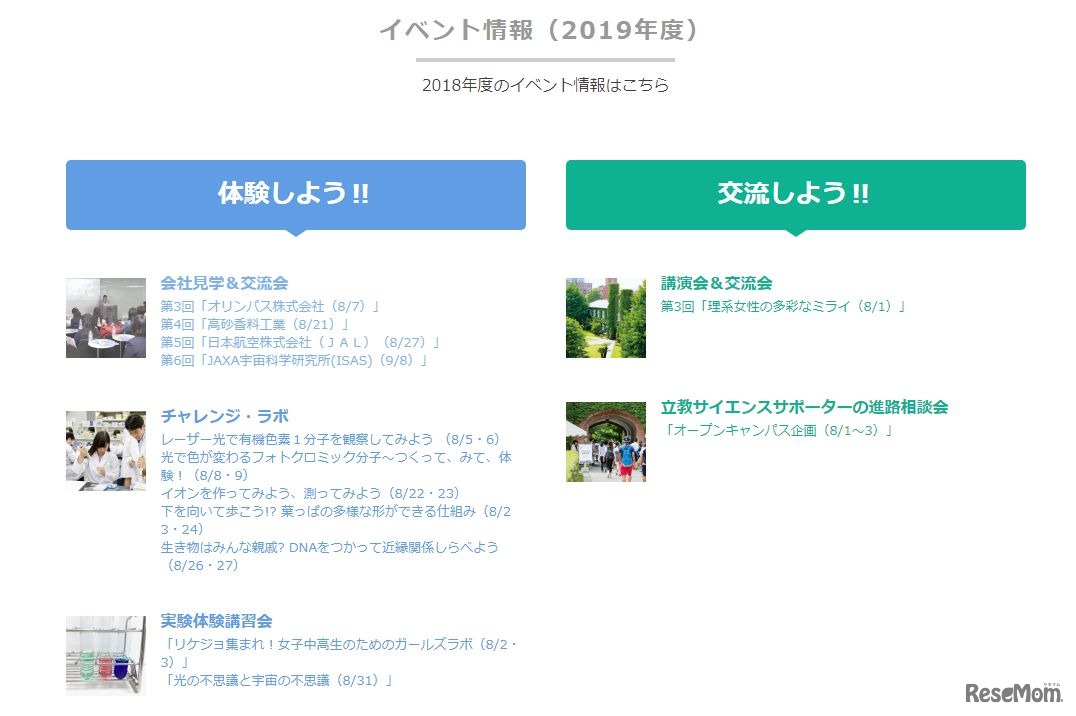 立教大学理学部は、2019年8月から9月にかけて開催する2019年度「科学の未来を創る女子中高生のチャレンジ・ラボ」への参加申込受付を開始した。イベントでは、会社見学&交流会や実験講座などさまざまなプログラムを用意している。