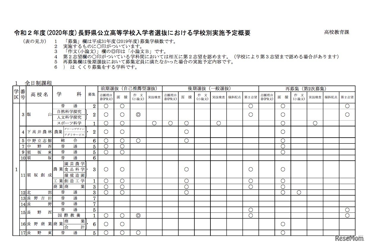 令和2年度(2020年度)長野県公立高等学校入学者選抜における学校別実施予定概要