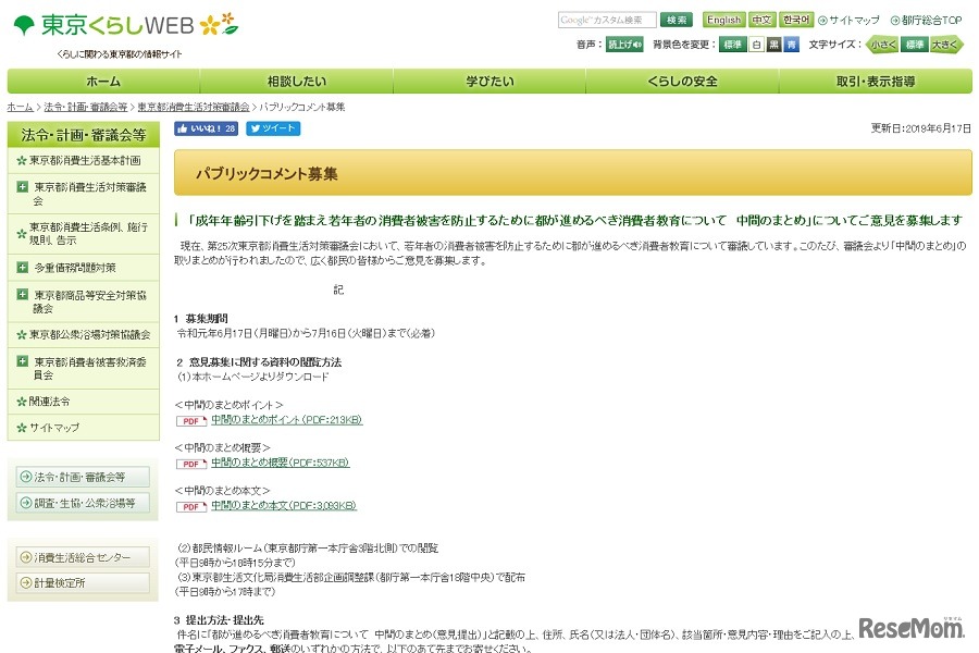 東京都は、「成年年齢引下げを踏まえ若年層の消費者被害を防止するために都が進めるべき消費者教育について 中間まとめ」を公表した。2019年6月17日から7月16日(必着)まで、都民からの意見をメール・FAX・郵送にて募集している。