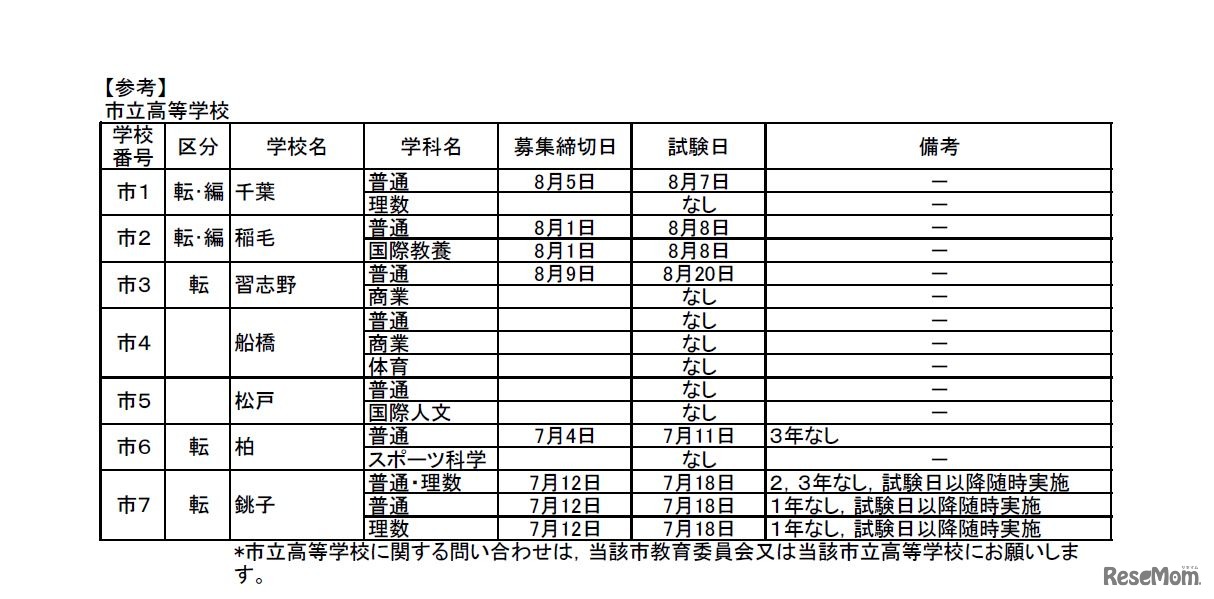 画像出典:千葉県教育委員会 市立高校(全日制)の転・編入学試験の実施予定