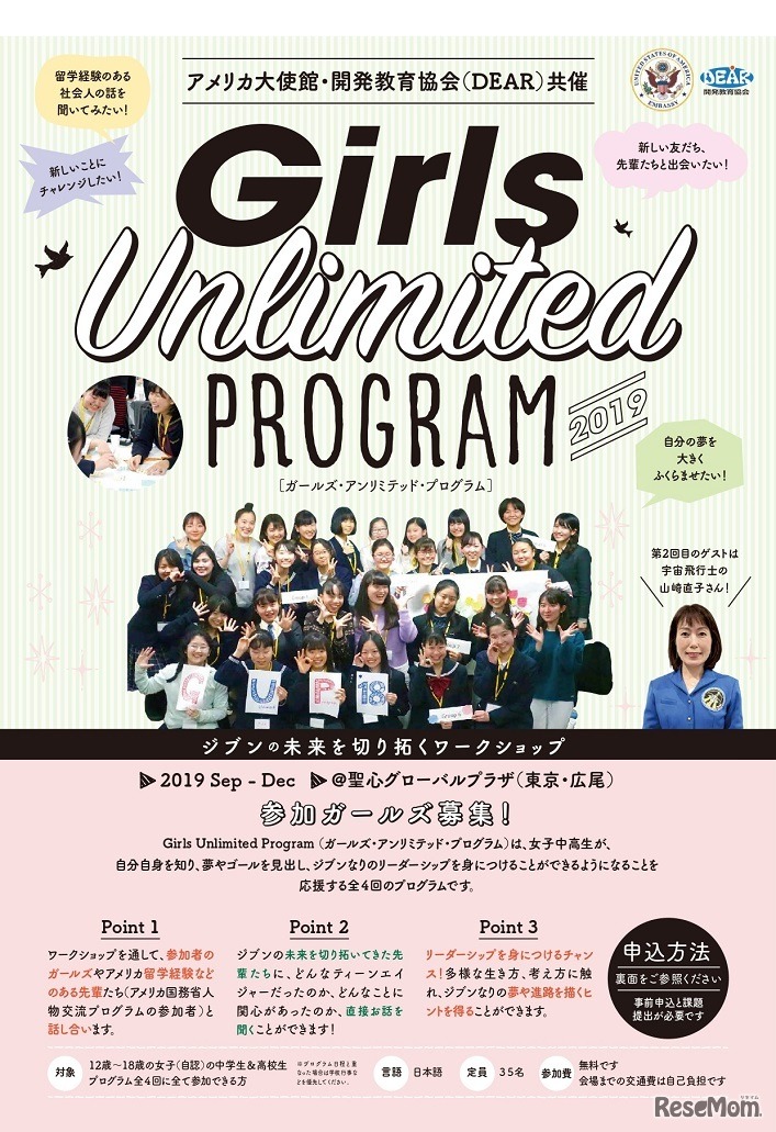 アメリカ大使館と開発教育協会(DEAR)は2019年9月から12月、女子中高生を対象とした全4回のプログラム「Girls Unlimited Program2019(ガールズ・アンリミテッド・プログラム)」を開催する。第2回には宇宙飛行士の山崎直子氏をゲストに迎える。参加費は無料。
