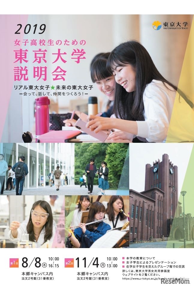 東京大学は2019年8月8日と11月4日、「女子高校生のための東京大学説明会」を開催する。在学女子学生によるプレゼンテーション、グループごとの交流会などを通して東大女子のリアルな姿に触れることができる。
