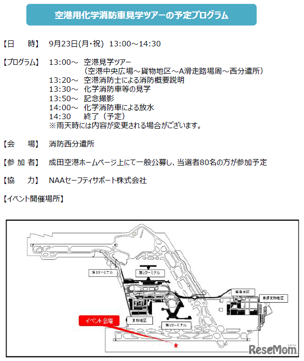 成田国際空港は、「空の日」「空の旬間」の記念事業として開催する「空の日フェスティバル2019」において、2019年9月23日に実施する「ジェット機との綱引き大会&空港見学ツアー」と「空港用化学消防車見学ツアー」の参加者を募集する。