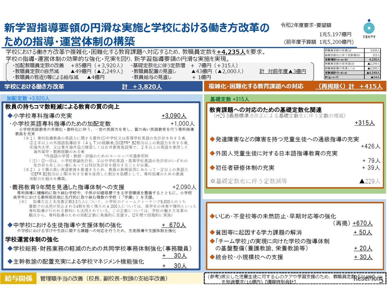 文部科学省は2019年8月29日、2020年度概算要求を発表した。総額は前年度比6,485億円増の5兆9,689億円。高速・大容量の通信ネットワークを整備する「GIGAスクールネットワーク構想」に375億円を計上したほか、教員の働き方改革などに向けて4,235人の教職員定数増を求めた。