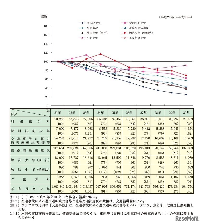 画像出典:警察庁「平成30年中における少年の補導および保護の概況」 非行少年などの検挙・補導人員の推移