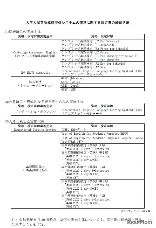 大学入試センターは2019年8月30日、大学入試英語成績提供システムの運営に関する協定書の締結状況を公表した。成績提供対象予定である6団体22試験のうち、協定書の締結を終えたのは3団体13試験。残る3団体9試験とは、8月30日時点で協定書締結までには至っていない。