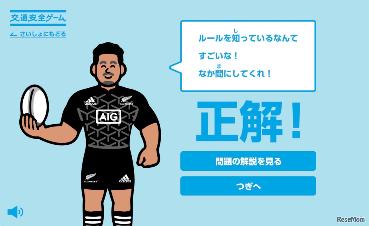 AIG損害保険は2019年9月12日、子どもの交通安全推進に向け、小学校低学年を対象に交通安全に必要な知識を親子で一緒に楽しく学ぶことができるオンラインゲーム「ALL BLACKS 交通安全ゲーム」の提供を開始した。パソコンやスマートフォンから無料で何度もトライできる。