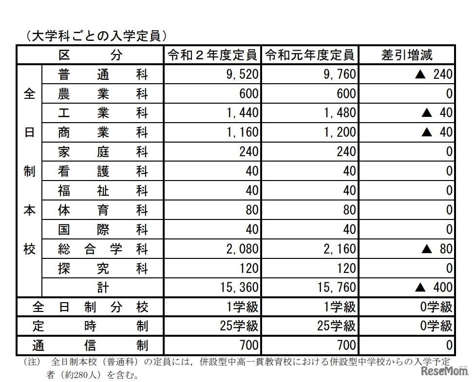 広島県教育委員会は2019年9月13日、2020年度(令和2年度)広島県公立高校の入学定員を決定した。全日制本校は前年度(2019年度)と比べ400人減の1万5,360人募集する。定時制が25学級、通信制が700人で前年度と同数。