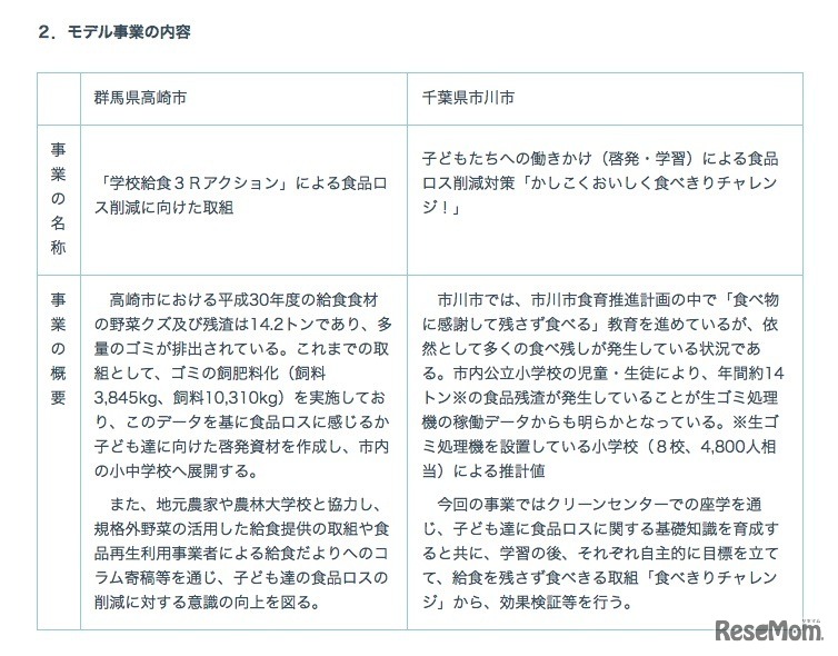 環境省は2019年9月17日、2019年度における学校給食の実施に伴い発生する廃棄物の3R促進モデル事業の実施市区町村として、群馬県高崎市と千葉県市川市を選定したことを公表。事業の妥当性、先進性やほかの地域への波及効果、実現可能性などの観点から選ばれた。