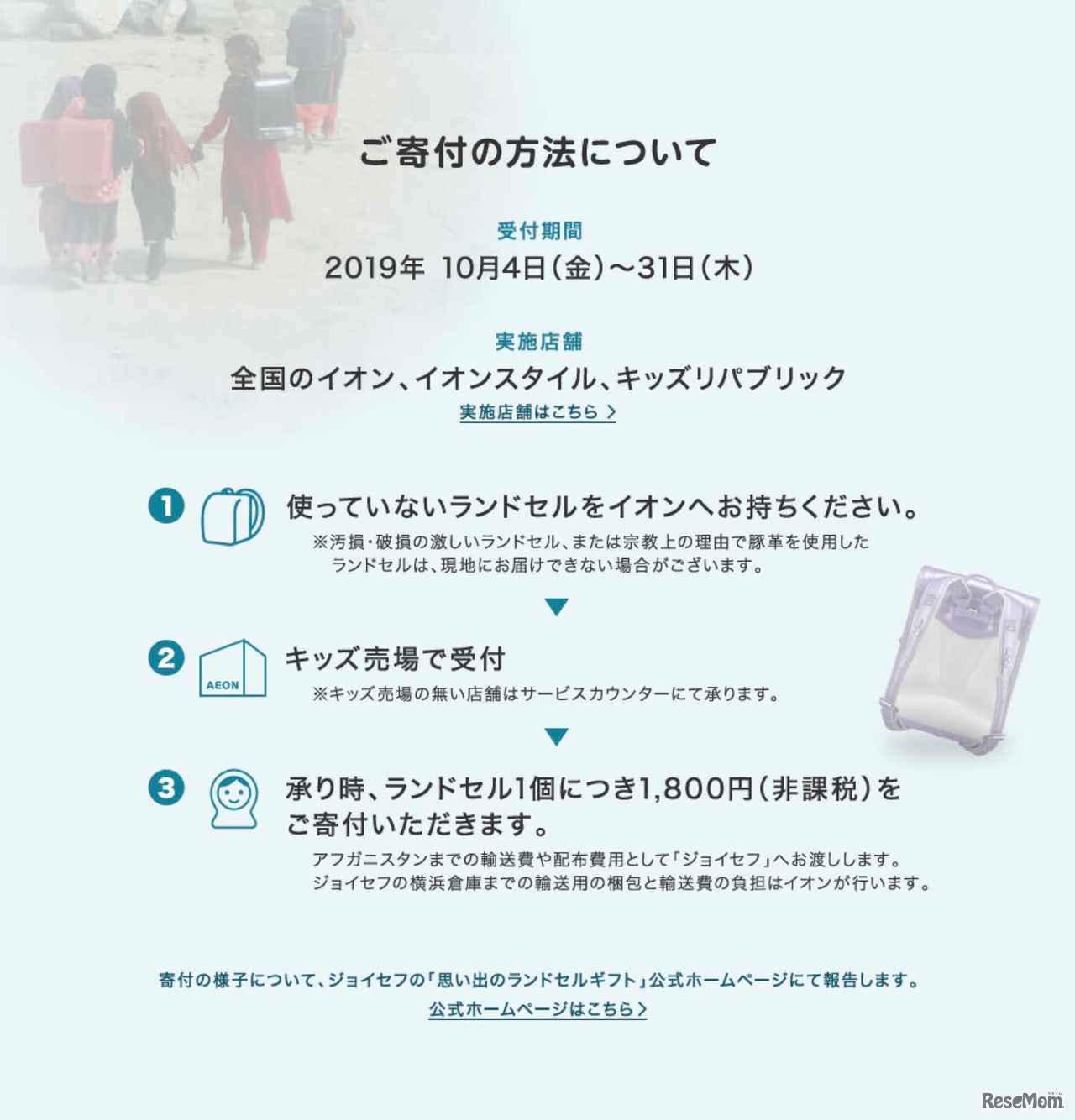イオンは2019年10月4日から10月31日の期間、アフガニスタンの子どもたちに使い終わったランドセルを届ける国際協力NGOジョイセフの支援活動「思い出のランドセルギフトプロジェクト」を約440店舗で実施する。期間中、各店舗にて使い終わったランドセルの寄付を受け付ける。