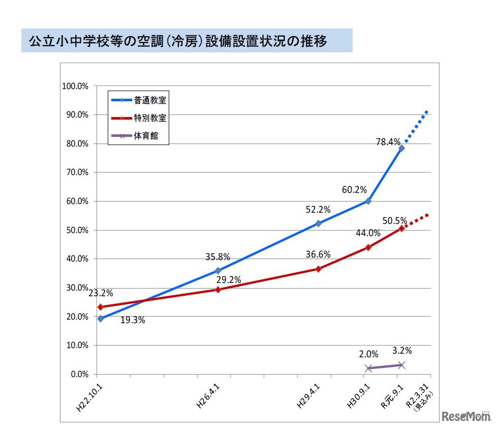 公立学校の冷房設置率は78.4%と、前年度より18.2ポイント増えていることが2019年9月19日、文部科学省の調査結果から明らかになった。公立小中学校普通教室の冷房設置率は、2019年度末には北海道、青森県、秋田県を除く全都府県が80~100%に達する見込みだという。