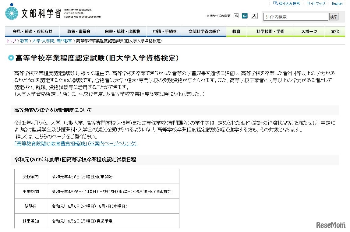 文部科学省は2019年8月6日と7日に実施した2019年度(令和元年度)第1回高等学校卒業程度認定試験(高卒認定試験)について、台風8号の影響や運営上のミスにより、10会場において9月3日と4日の2日間、再試験を実施した。再試験対象者数は786人。