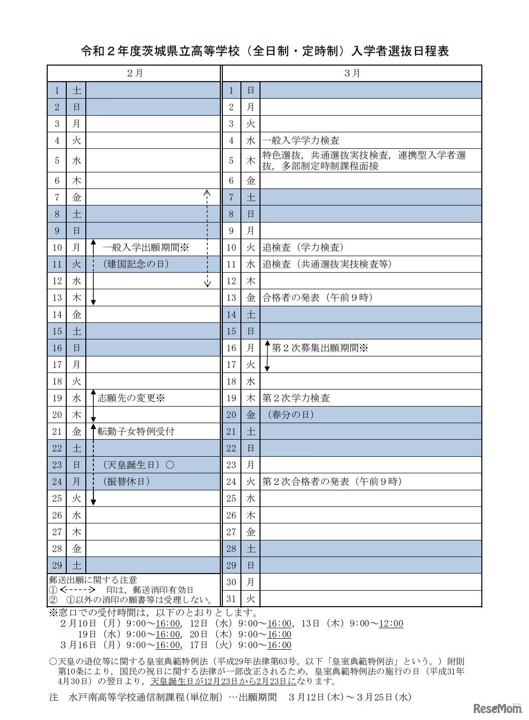 令和2年度茨城県立高等学校(全日制・定時制)入学者選抜日程表