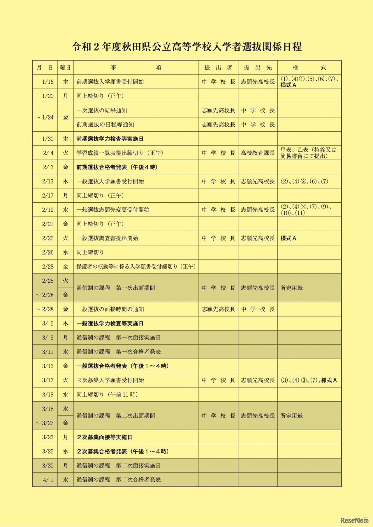 画像出典:秋田県教育委員会「令和2年度秋田県公立高等学校入学者選抜実施要項」 2020年度秋田県公立高等学校入学者選抜関係日程