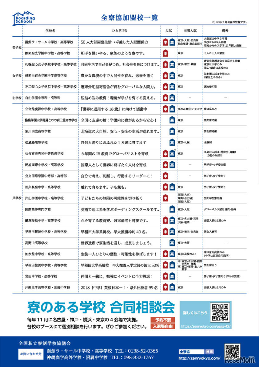 全国私立寮制学校協議会(全寮協)は2019年11月、名古屋・神戸・横浜・東京の4会場にて全国23校が参加する「寮のある学校合同相談会」を開催する。参加無料・予約不要・入退場自由。