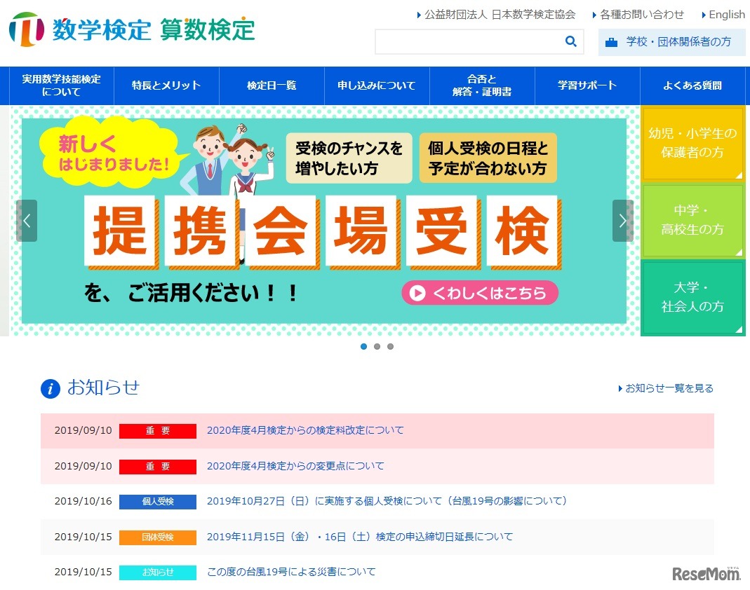 日本数学検定協会は2019年10月15日、実用数学技能検定(数学検定・算数検定)団体受検の申込みの締切日を延長したことを公表した。台風の影響を受けた地域を考慮し、すべての地域において締切日を変更する。
