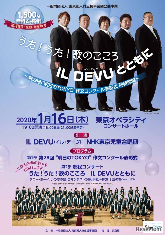 東京都人材支援事業団は2020年1月16日、都民コンサート「うた!うた!歌のこころ IL DEVUとともに」を開催する。都内在住・在勤・在学者を対象に、抽選で1,500名を無料招待。観覧申込は、Webサイトまたは往復はがきにて受け付けている。応募締切は12月16日(必着)。