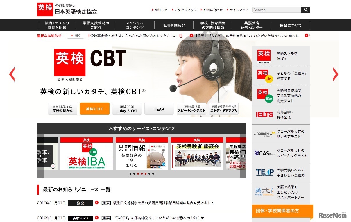 日本英語検定協会(英検協会)は2019年11月1日、文部科学省による英語民間試験活用の延期発表を受けて、「大学入試英語成績提供システム」にかかる英検協会の各種試験に関する対応を公表。すでに発表している会場等の2020年度の実施概要について、一旦見直すという。
