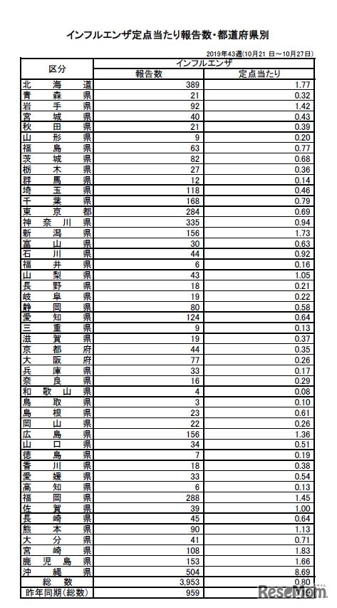 厚生労働省は2019年11月1日、第43週(2019年10月21日~27日)のインフルエンザ発生状況を発表した。定点あたり患者報告数は0.80人で、前週の0.72人より増加。32都道府県で前週より定点あたり患者報告数が増えており、学級閉鎖が急増している。