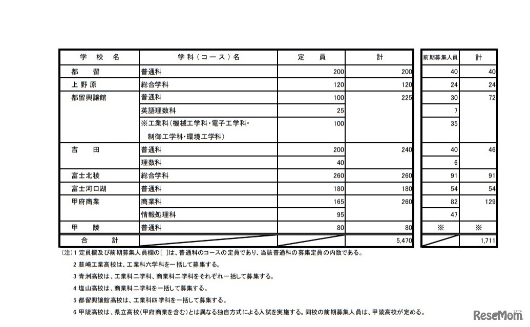 画像出典:山梨県教育委員会 令和2年度山梨県公立高等学校入学者募集定員(全日制課程)
