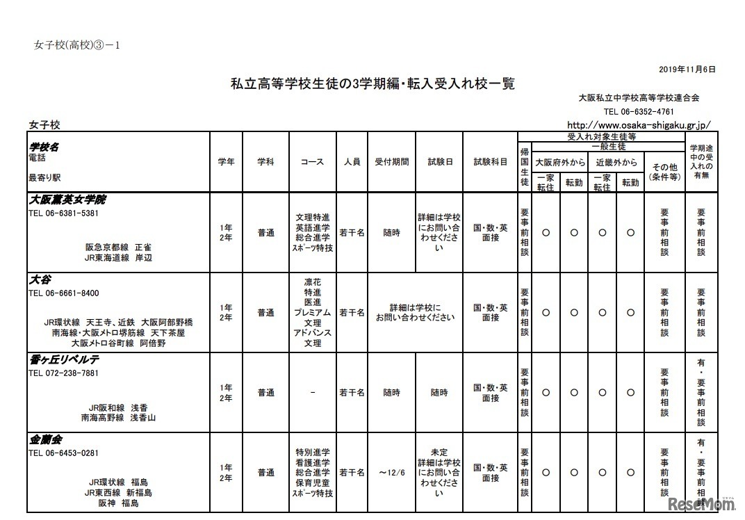 大阪私立中学校高等学校連合会は2019年11月7日、大阪府私立中学校・高等学校の2019年度3学期編転入受入校情報を掲載した。中学校は30校、全日制高校は28校が編転入を受け入れる。