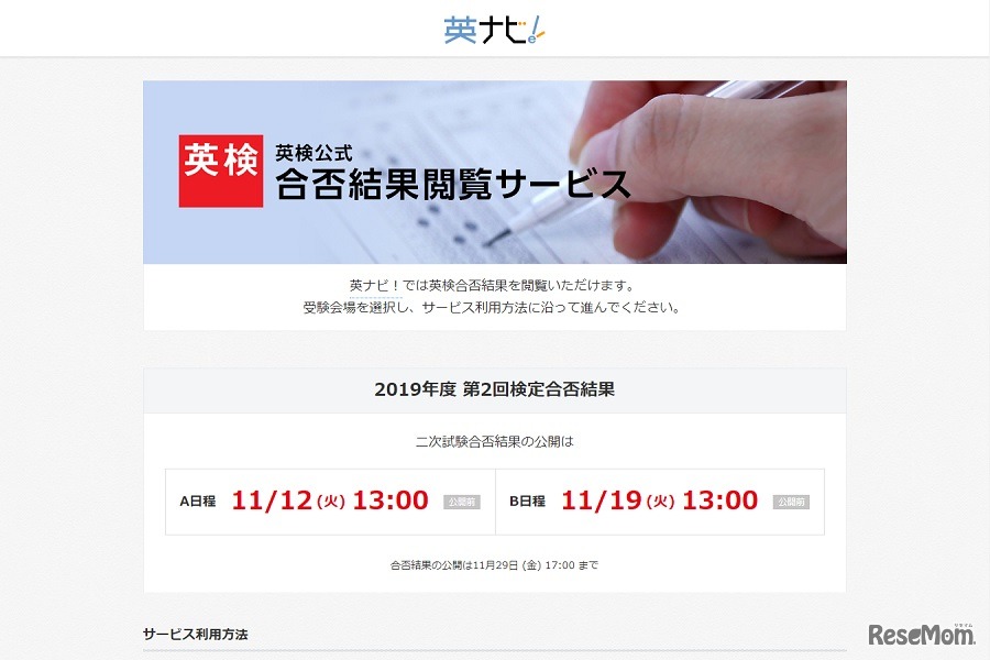 日本英語検定協会(英検協会)は2019年11月12日、Webサイトで「2019年度第2回実用英語技能検定(英検)二次試験」A日程の合否結果・成績表閲覧サービスを開始する。団体向けは正午以降、個人(英ナビ!会員)は午後1時以降に公開予定。